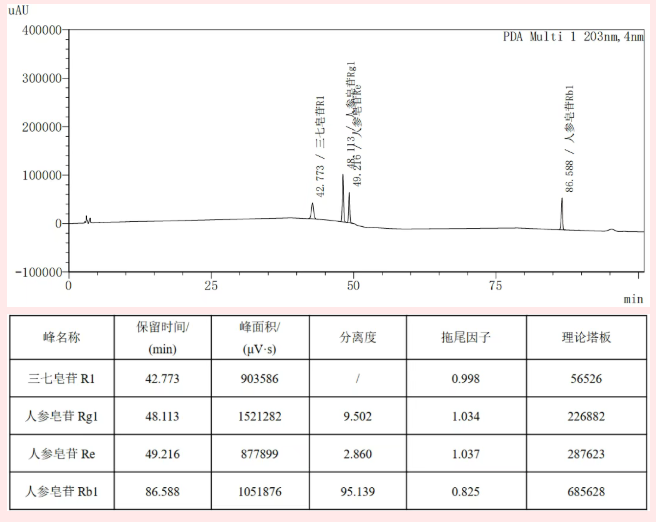 使用恒谱生Hsol?三七皂苷专用柱,5μm,4.6mm×250mm色谱柱,在该条件下,进行测试,满足理论塔板数按人参皂苷Rg1峰计算应不低于6000,人参皂苷Rg1与人参皂苷Re的分离度应大于1.8的要求。